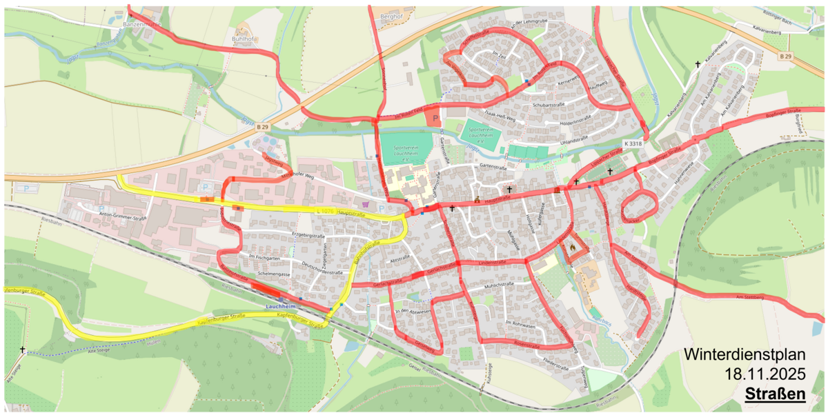 Für den Winterdienst auf öffentlichen Straßen der Gemeinde ist die Kommune zuständig. Dort besteht die Räum- und Streupflicht innerhalb geschlossener Ortschaften grundsätzlich nur an verkehrswichtigen und zugleich gefährlichen Stellen. Die aktuellen Fahrstrecken der Räumfahrzeuge sind auf den untenstehenden Winterdienstplänen dargestellt.